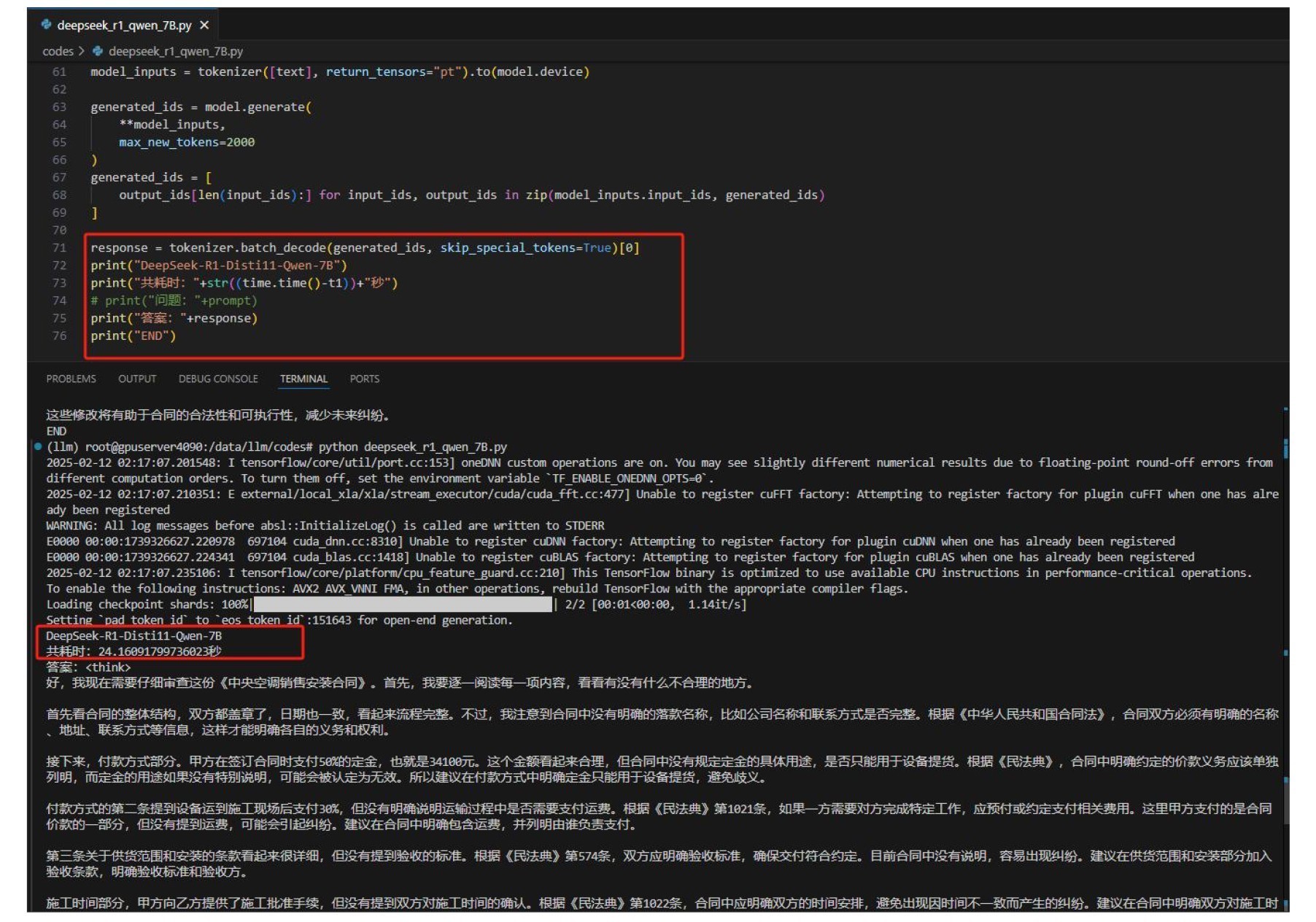 在测试的过程中我们设置max_new_tokens=2000,审查的测试合同字数为969个字,共耗时24.16秒,平均生成速度约为 82.8 tokens/秒。下图为我们使用DeepSeek的输出过程与输出结果。