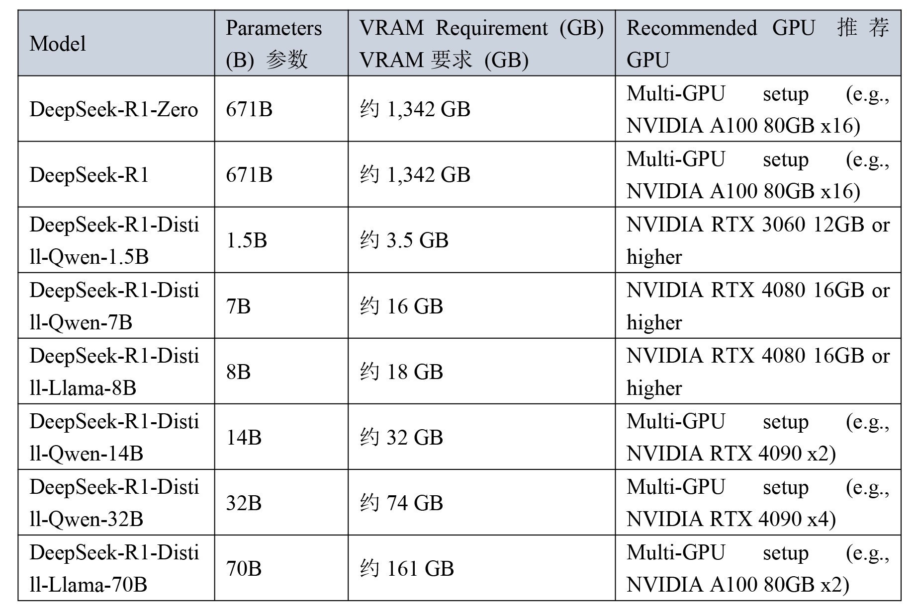 表 DeepSeek R1系列大模型推荐使用的GPU参考
