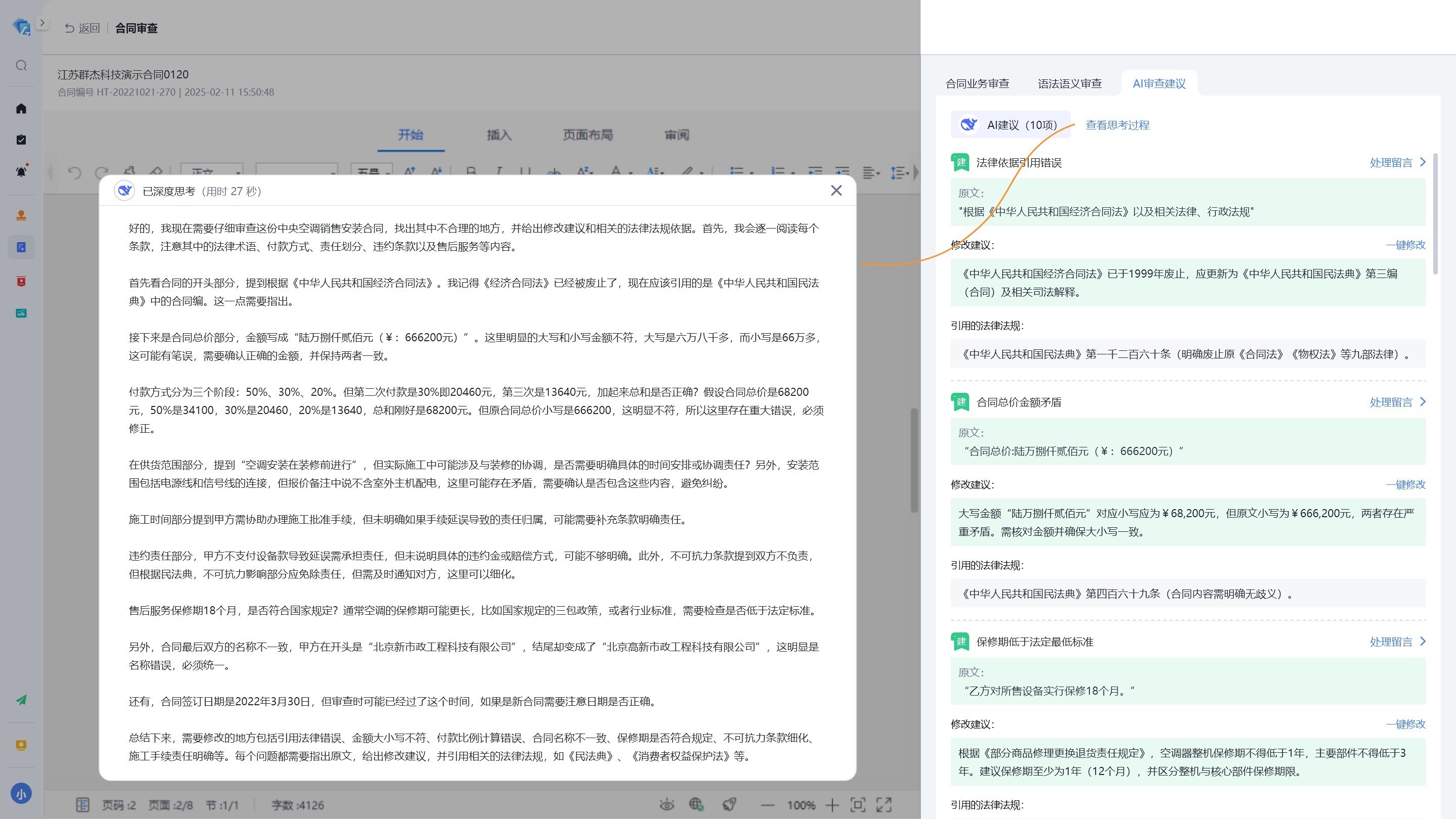 对合同内容条款进行深度分析,识别其中可能存在的法务风险、合规问题、业务不合理的条款。基于比以往更强大的推理能力,能够对合同中的潜在的计算逻辑等业务风险进行预警。
