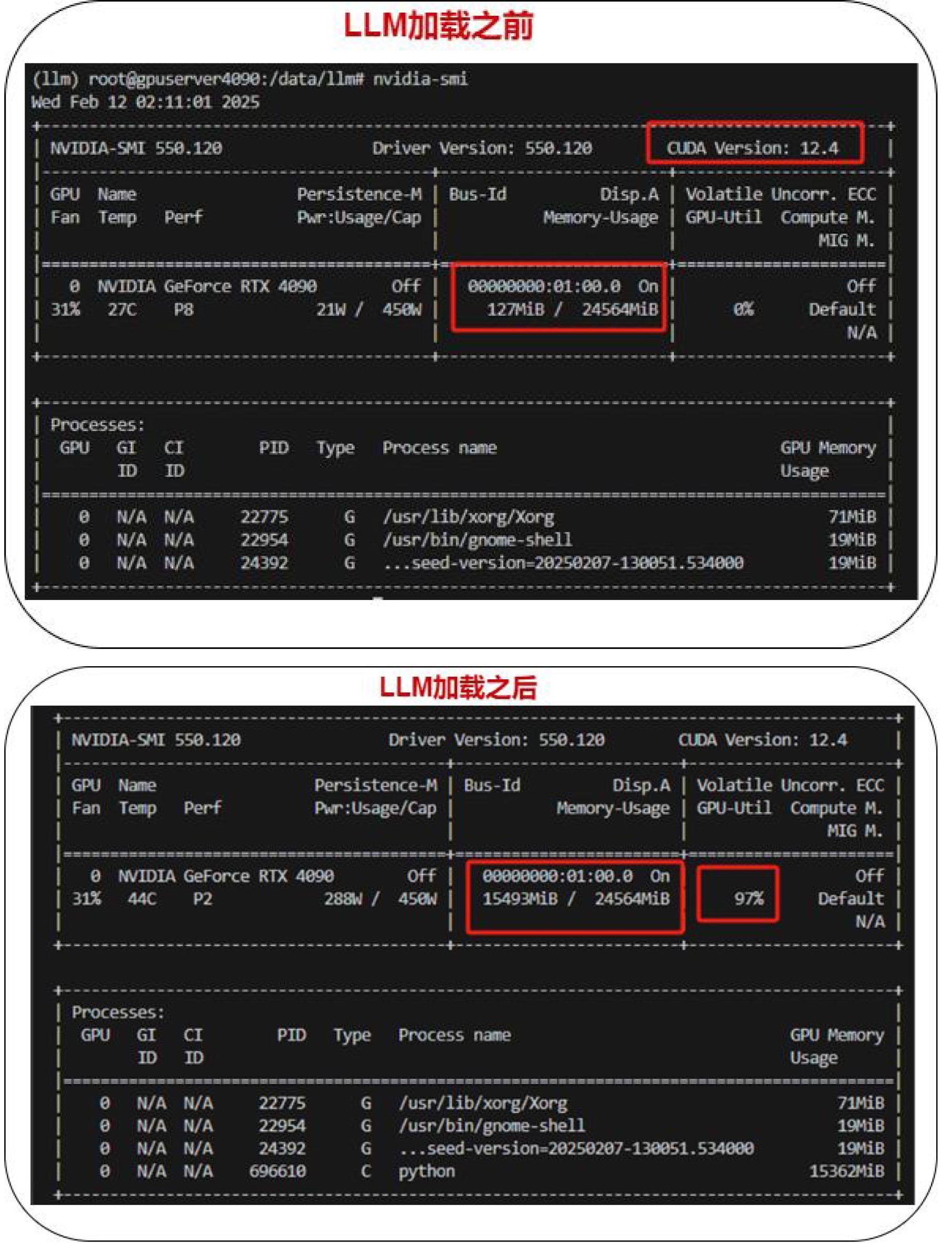 我们在NVIDIA GeForce RTX 4090、驱动版本: 550.120、Cuda=12.4、python=3.10.0的服务器上测试了DeepSeek-R1-Distill-Qwen-7B的推理效果,结果显示显存占用约15.3GB,GPU的利用率高达97%。